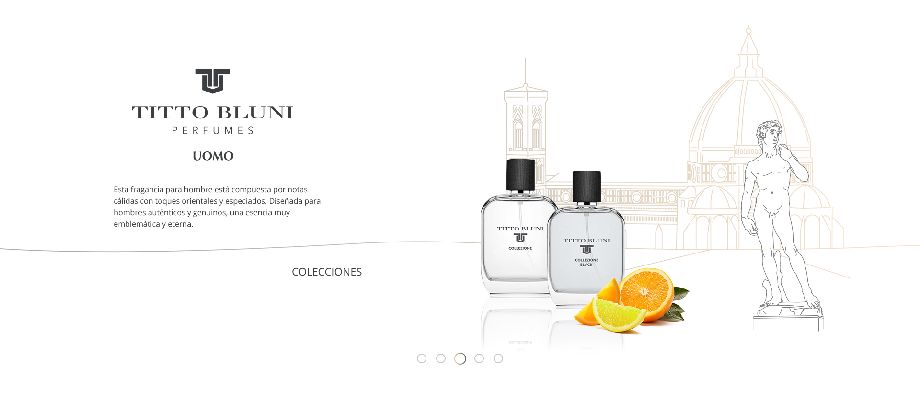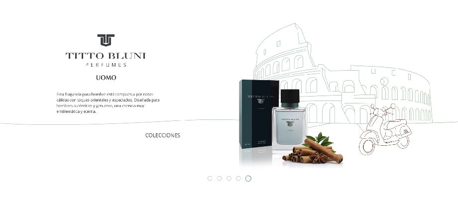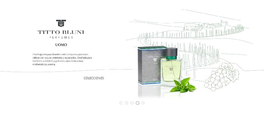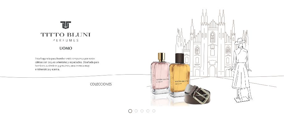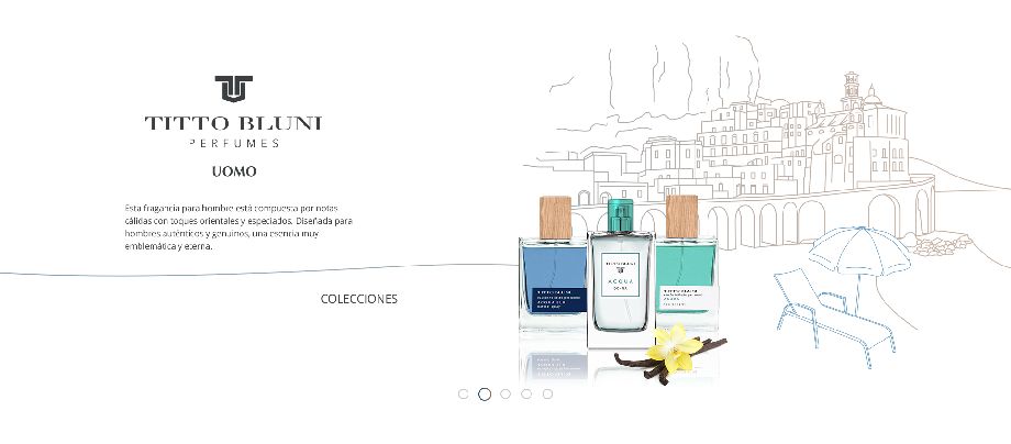 Para el diseño del site promocional de Titto Bluni optamos por una línea estética en la que los perfumes cobran absolutamente todo el protagonismo en una animación dentro de un carrusel en la que el fondo representa la ubicación que inspiró a los creadores de cada uno de los perfumes que se pretendía promocionar.