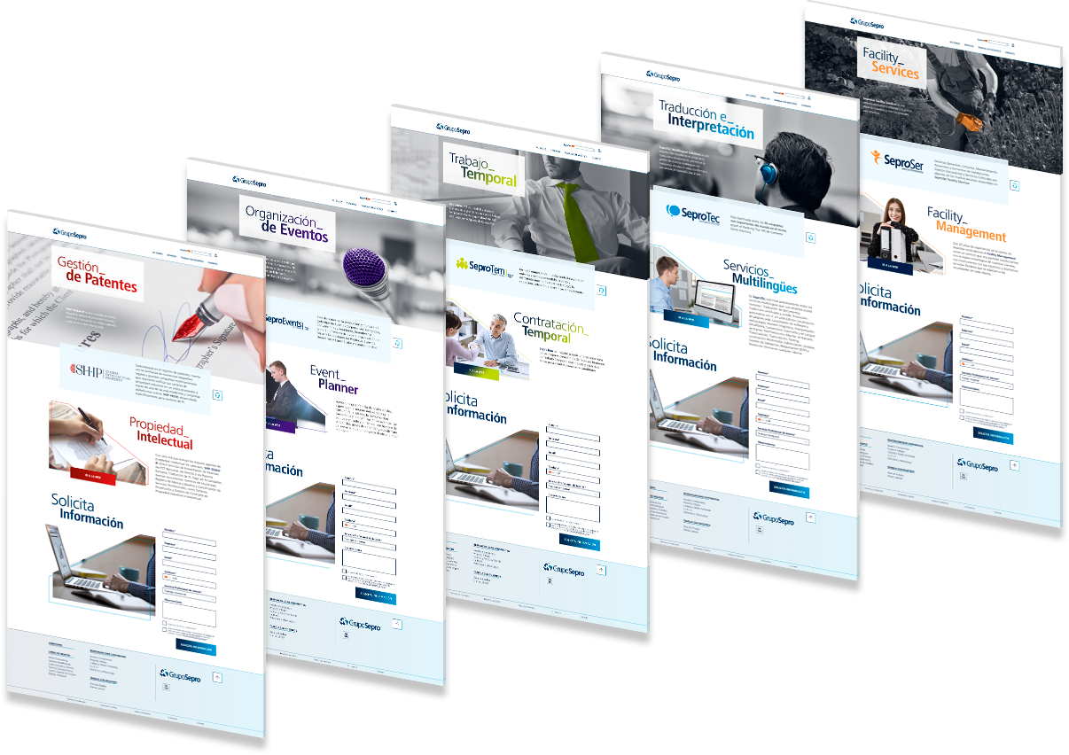 Representa visualmente todos los servicios que GrupoSepro ofrece manteniendo el equilibrio entre sus distintas marcas y sus correspondientes colores corporativos sin perder la esencia de conjunto y con una línea visual coherente y unificada.